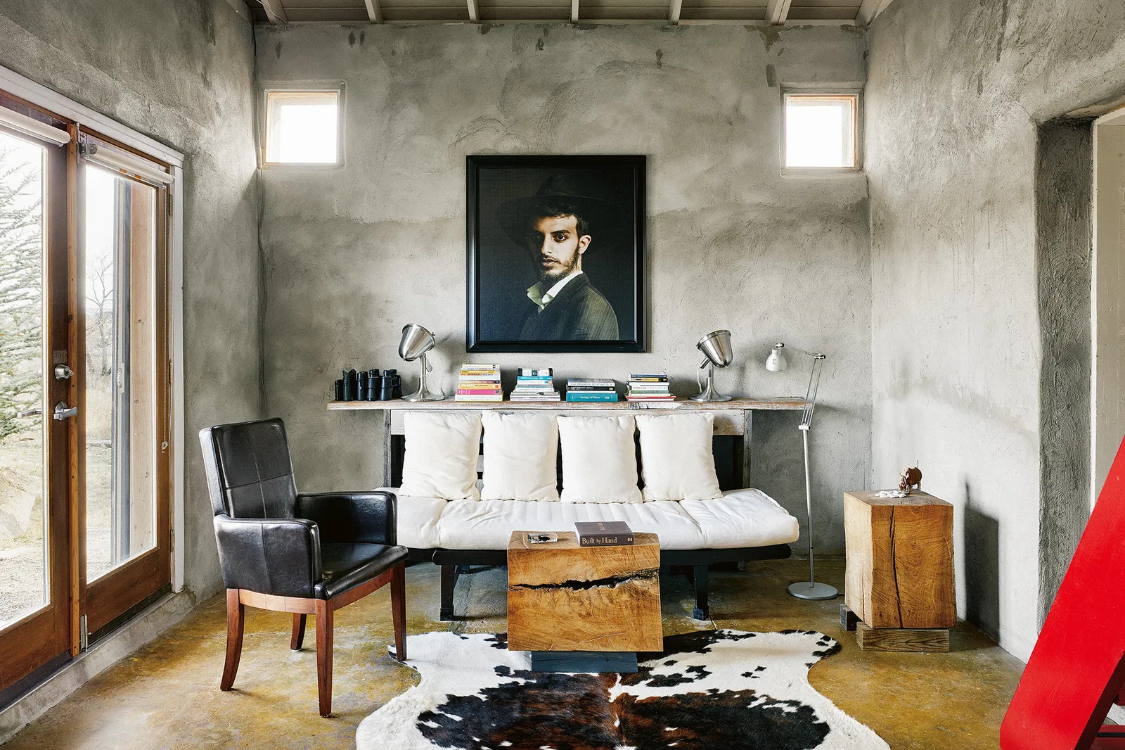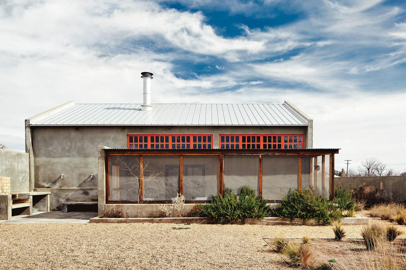 On a lot adjacent to a gas station and a few blocks west of downtown, Jamey Garza of Garza Marfa designed a 1,200-square-foot cinder-block house covered in gray stucco for a couple from Los Angeles seeking a unique design experience in Marfa. Although the couple initially envisioned a roadhouse, they opted for a private retreat after reconsidering logistical and practical aspects. The concrete floors from the original design were retained, while exposed steel trusses and cypress ceilings were added to the main room, which incorporates living, dining, sleeping, and cooking areas. Casement windows, painted a vibrant orange using auto body lacquer, wrap around three sides of the room. Inside, white hard-plaster walls contrast with the velvety gray stucco exterior. A screened porch on the west side provides shade and a perfect spot for catching breezes.