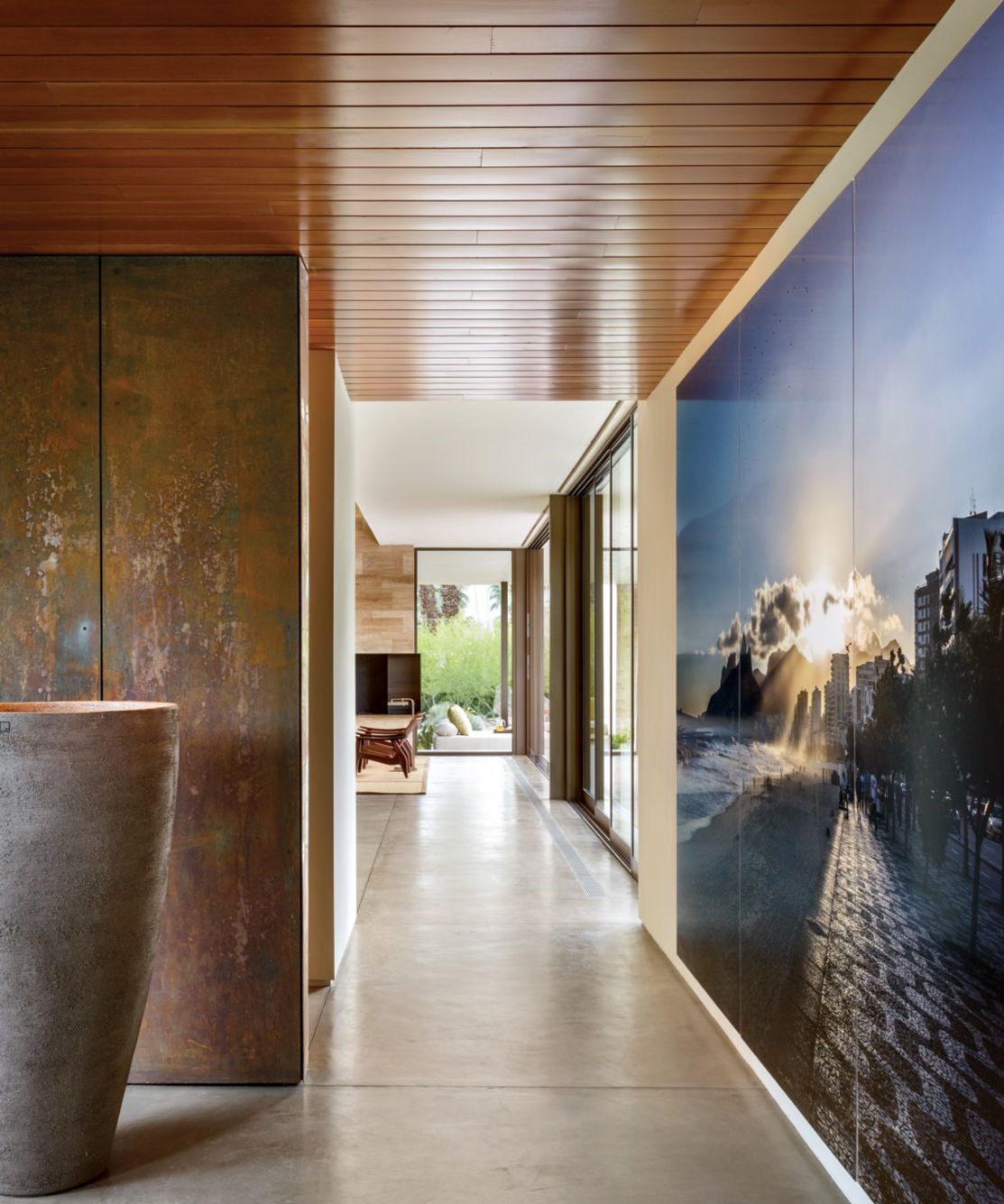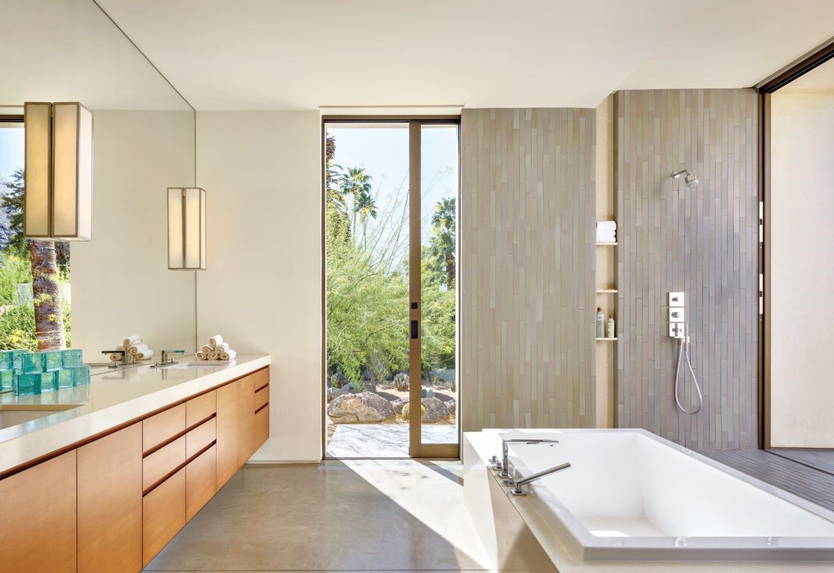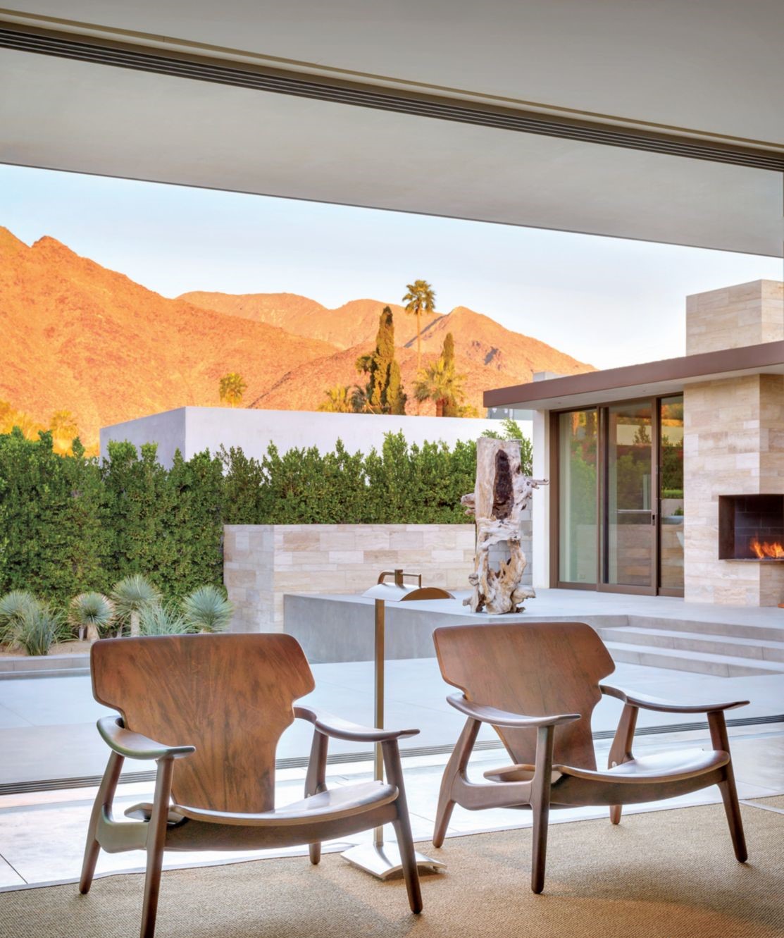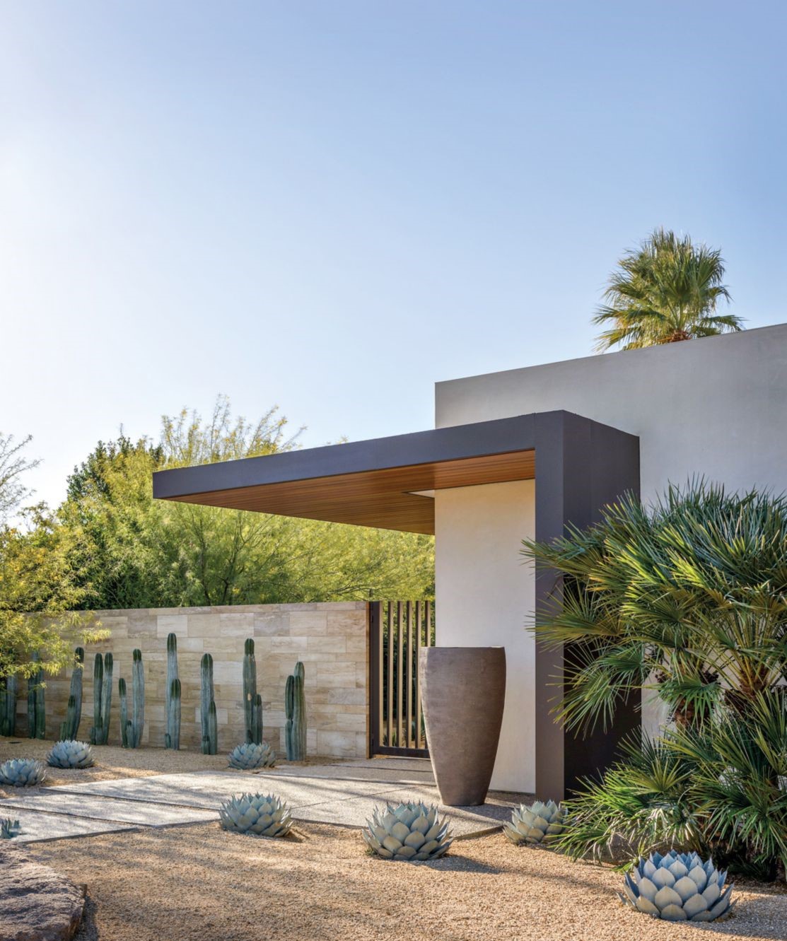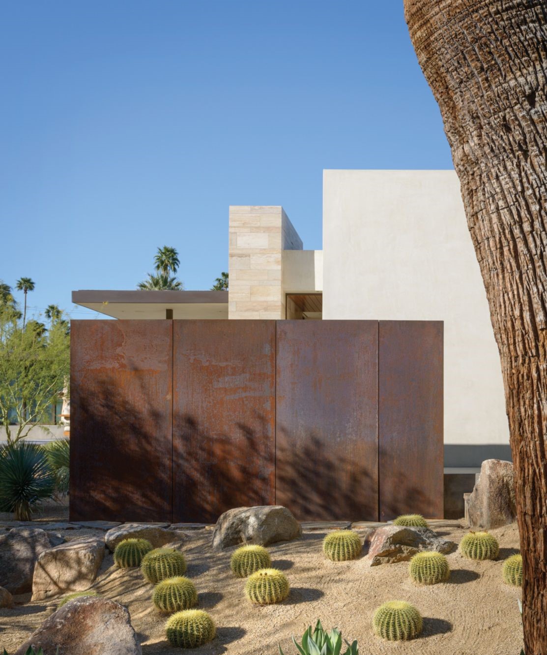 The house seamlessly integrates with its desert surroundings through the use of stone, wood, concrete, and weathered Cor-Ten steel, complemented by floor-to-ceiling windows that connect indoor and outdoor spaces. The design embraces a vibrant desert palette, highlighted by chartreuse accents that emerged from a surprising shift from muted colors to brighter hues inspired by the landscape. Art plays a significant role, with a blend of ancient and contemporary pieces reflecting the continuity of time. Nature is incorporated as art with elements like a Javanese log and Indonesian vine enhancing the outdoor spaces. Architecturally, the house is designed to maximize mountain views on a narrow lot with a meandering layout that unfolds progressively, creating a sense of discovery. Large eaves and a shaded outdoor great room protect against the intense afternoon sun. The minimalist interiors are balanced by a desert garden inspired by Japanese design, featuring raked gravel, large rocks, agave, cactus, and palo verde trees, contributing to the home's privacy and aesthetic harmony.