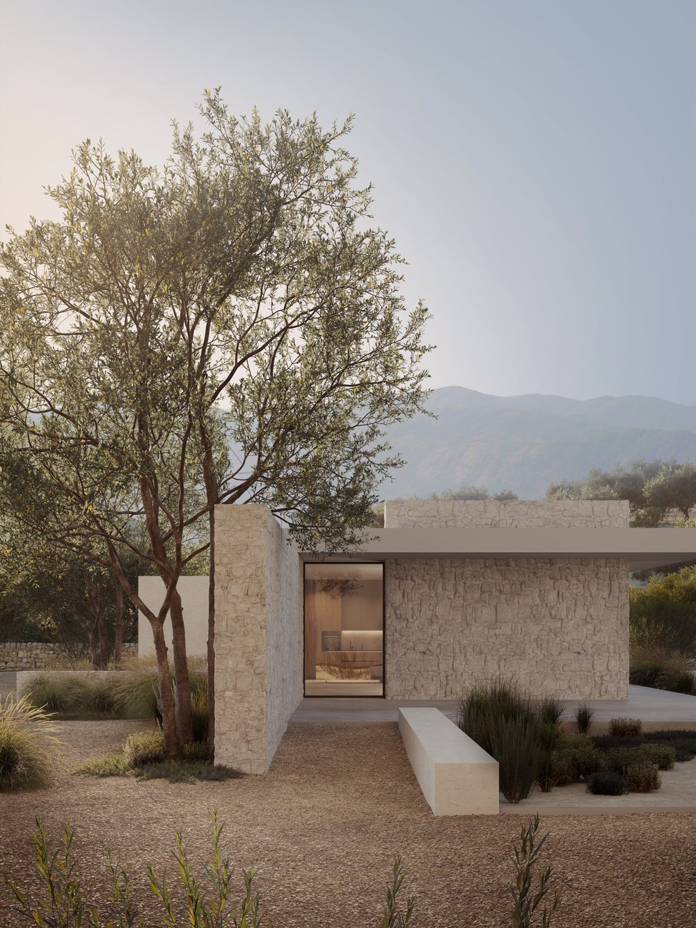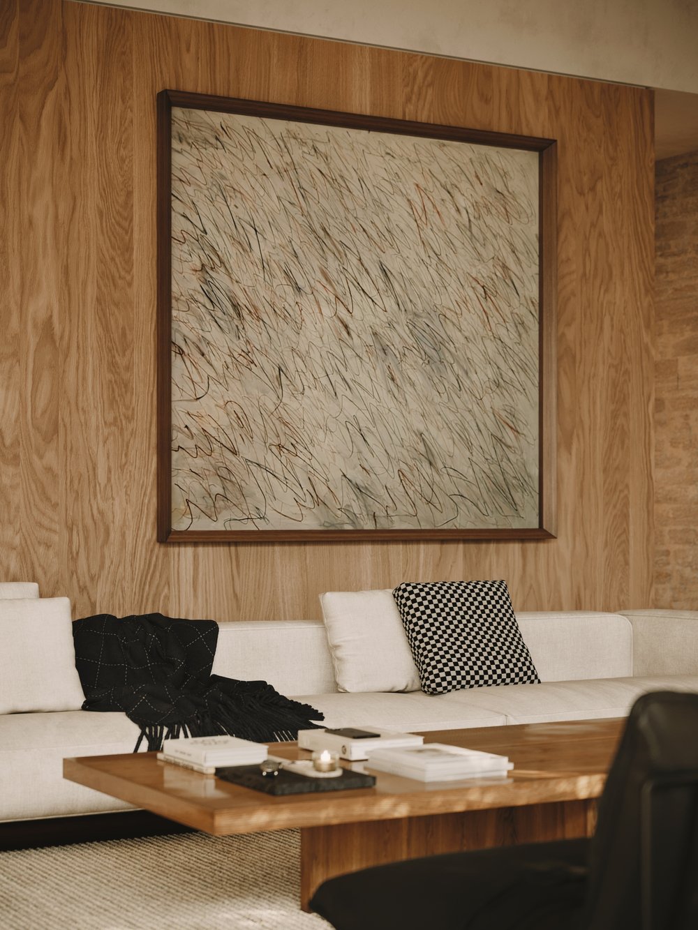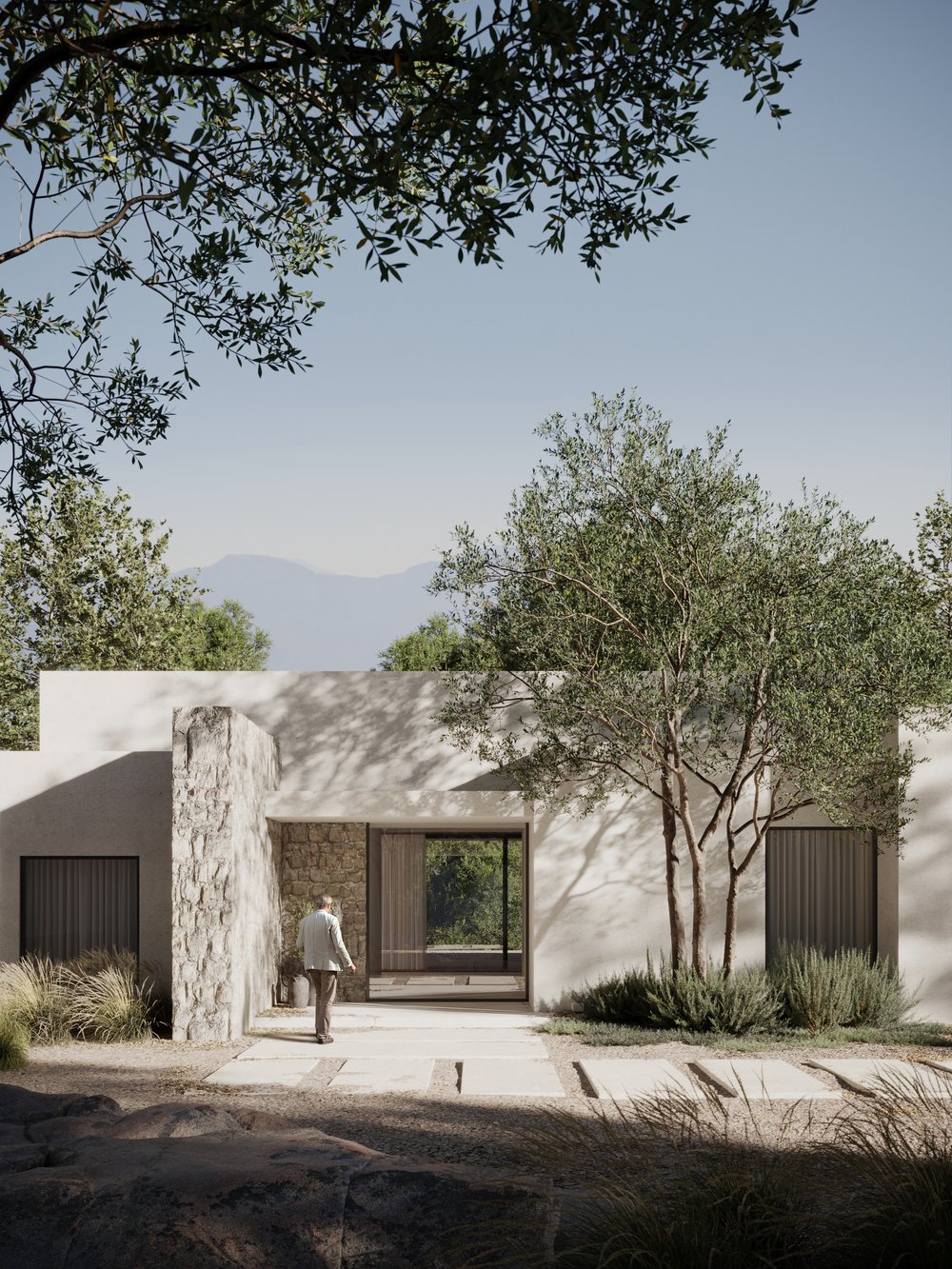 The selection of materials was meticulously curated to echo the natural colors and textures of the Ojai region. The warm sandy plaster walls create a cozy, inviting atmosphere, while white oak accents add a touch of elegance. Limestone, sourced directly from the site, connects the home to its environment in a meaningful way. This thoughtful material palette allows the residence to blend organically with the surrounding landscape, offering a dynamic range of hues and textures that evolve with the changing light and seasons.