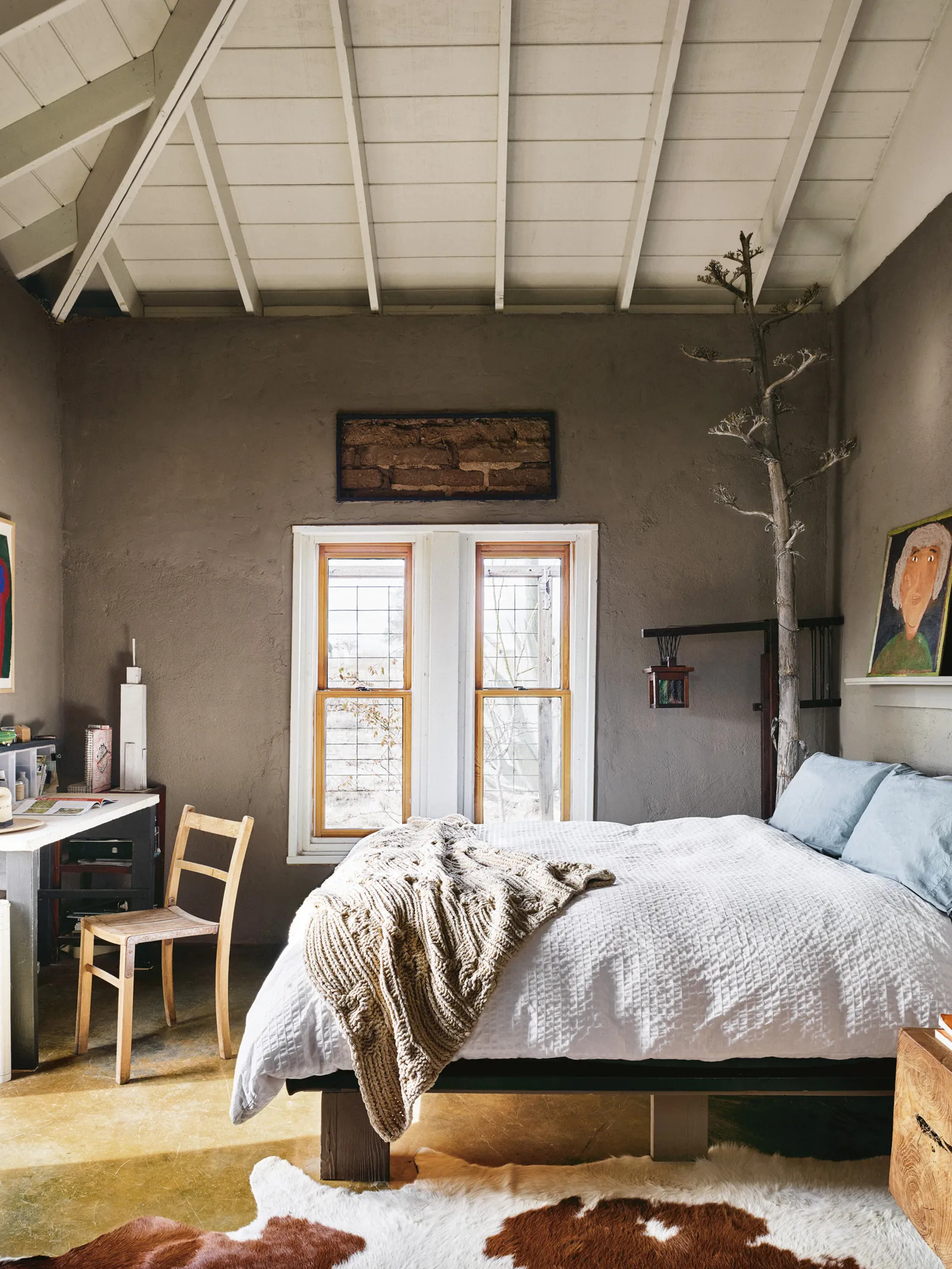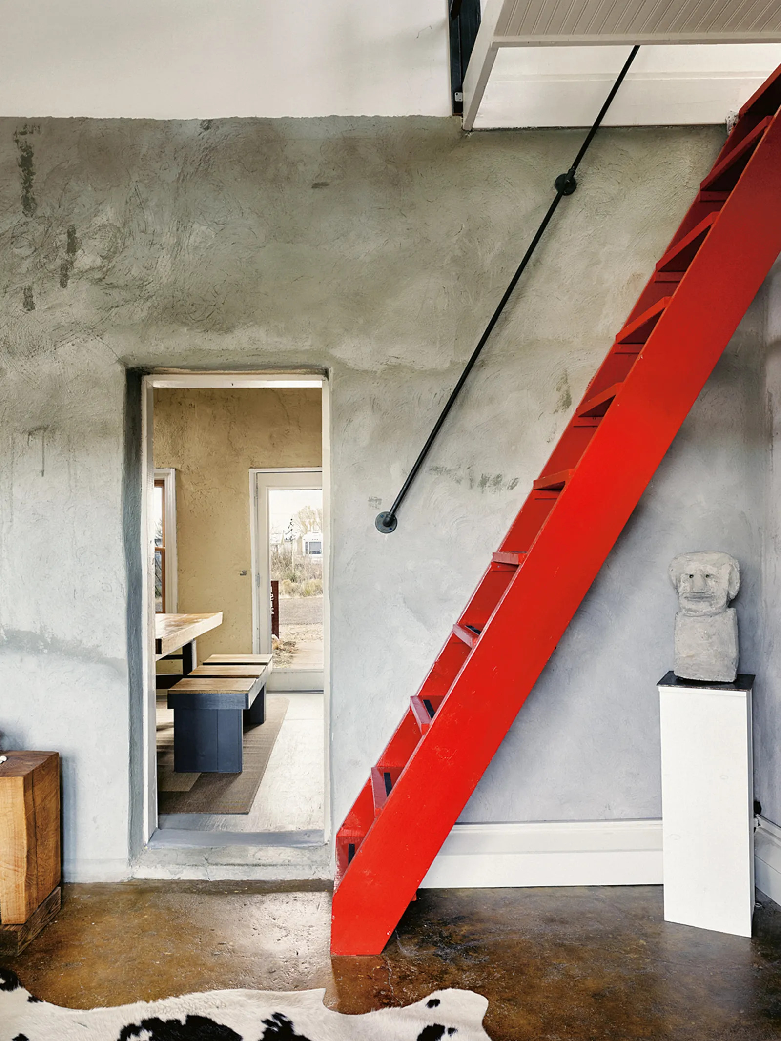 The home underwent a meticulous eight-year renovation by Austin-based chef Terry Nowell, who expanded the space with a new bathroom and an upstairs sleeping loft and updated the kitchen. Nowell also contributed personal touches, including a portrait he painted, a red ladder leading to the loft, and a dried agave plant in the downstairs bedroom to highlight the increased ceiling height (raised from seven to ten feet). A "truth window" above the windows reveals the original adobe brick, which, along with the exterior, is covered in cement. Nowell crafted several pieces of furniture, including a white pine bed, a wood block table, a desk, a floor lamp, and a wood side table.