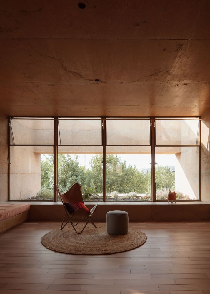 The home exudes warmth and simplicity both inside and out, creating a consistently inviting atmosphere. The pigmented concrete, with its tepetate color shades, imbues the spaces with a welcoming character that harmonizes with the natural light and surrounding landscape. By opting for understated materials, the focus shifts to the interplay of light and space, making them the true stars of the home.
