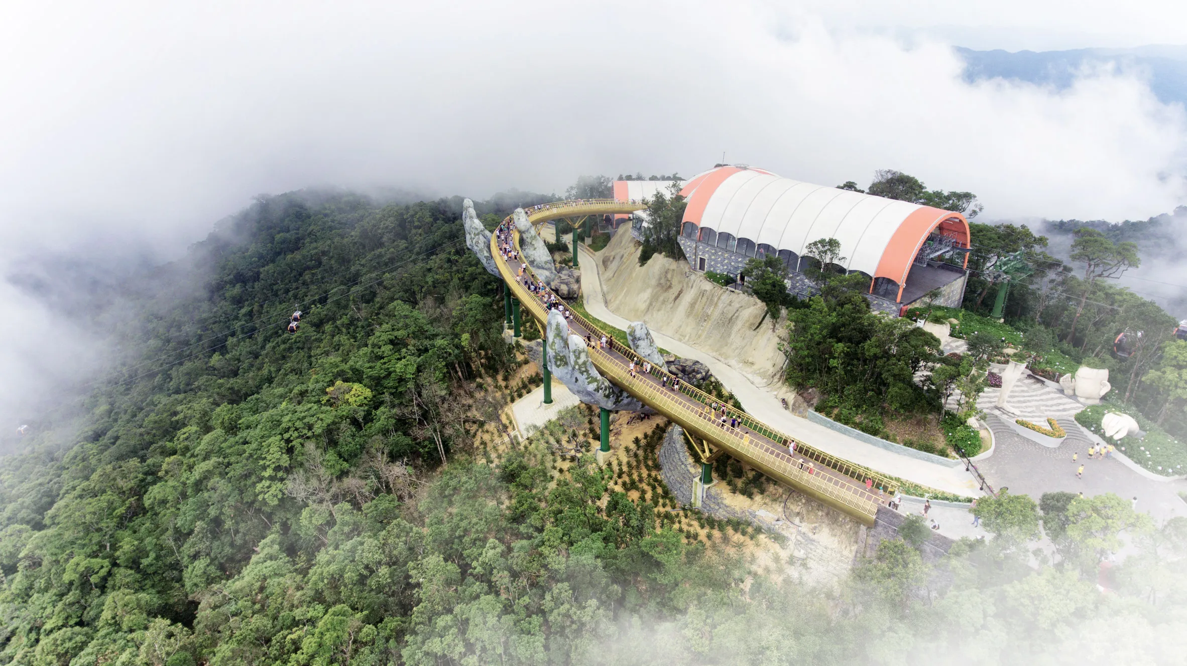 Designed by TA Landscape Architecture, the bridge serves both functional and aesthetic purposes. It connects the cable car station to the Le Jardin D'Amour gardens, providing visitors with a scenic route that avoids a steep incline. As visitors traverse the bridge, they are treated to panoramic views of the verdant mountains and distant coastline, often shrouded in mist, adding to the otherworldly ambiance. The Golden Bridge exemplifies how architecture can harmoniously blend with nature to create immersive experiences.