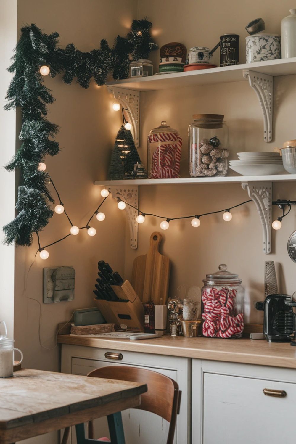 The kitchen is often overlooked when it comes to holiday decor, but it’s easy to add a festive flair. Decorate your shelves with mini wreaths or garlands. Display jars filled with red and green candies, ornaments, or cookie cutters on your countertops. Use holiday-themed tea towels and a festive rug near the sink to tie the look together. You can also hang a small wreath on cabinet doors or a strand of fairy lights above the counter for extra sparkle.
