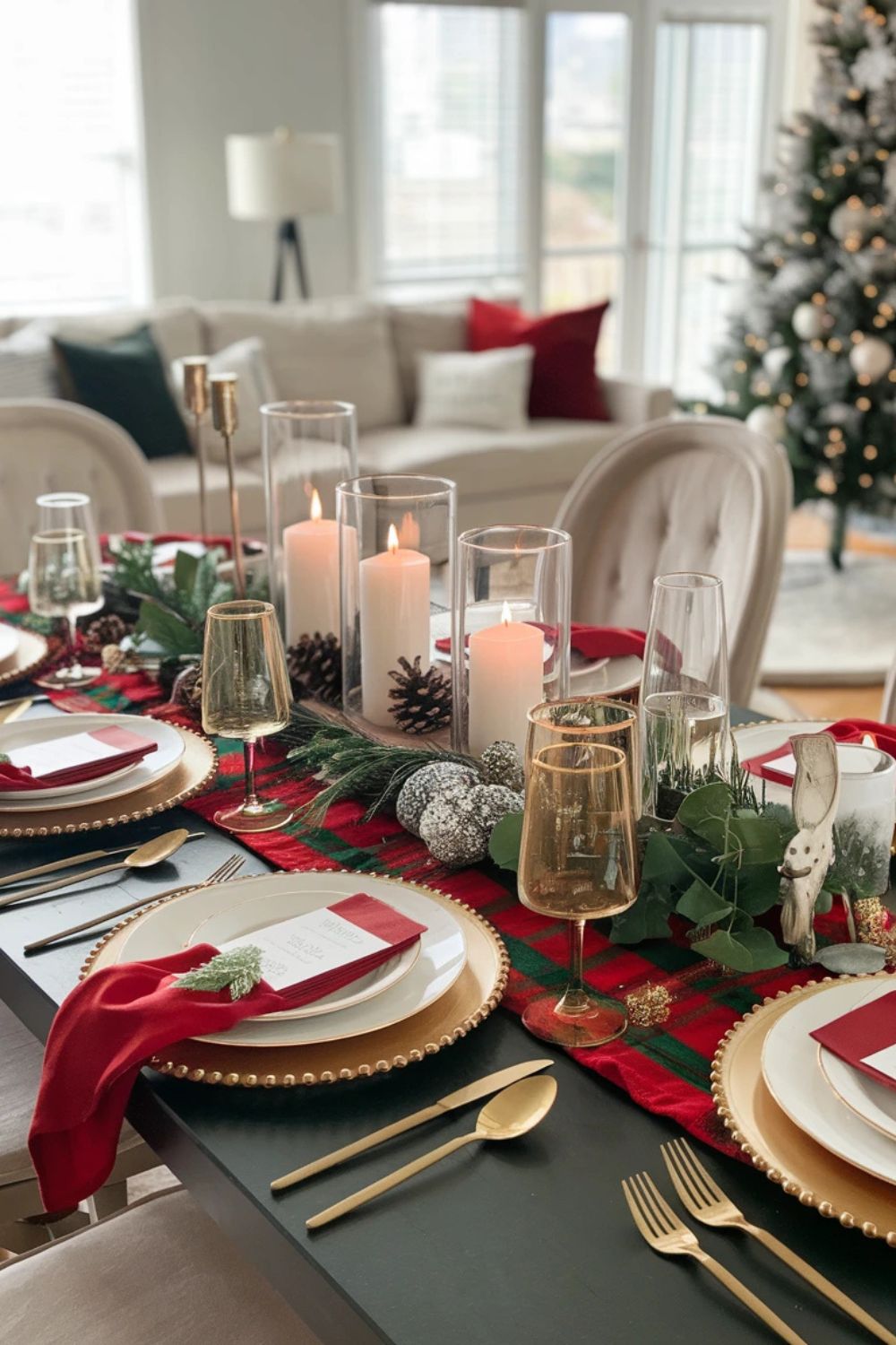 Your dining table is the centerpiece of Christmas gatherings, so let it shine. Lay down a seasonal table runner in colors like red, green, or gold. Use matching napkins and metallic napkin rings for a sophisticated touch. Add a stunning centerpiece—think a mix of candles, pinecones, and fresh greenery. You could also include festive touches like place cards shaped like snowflakes or mini Christmas stockings holding utensils. Incorporate small Christmas figurines or ornaments along the length of the table for a fun yet elegant look.