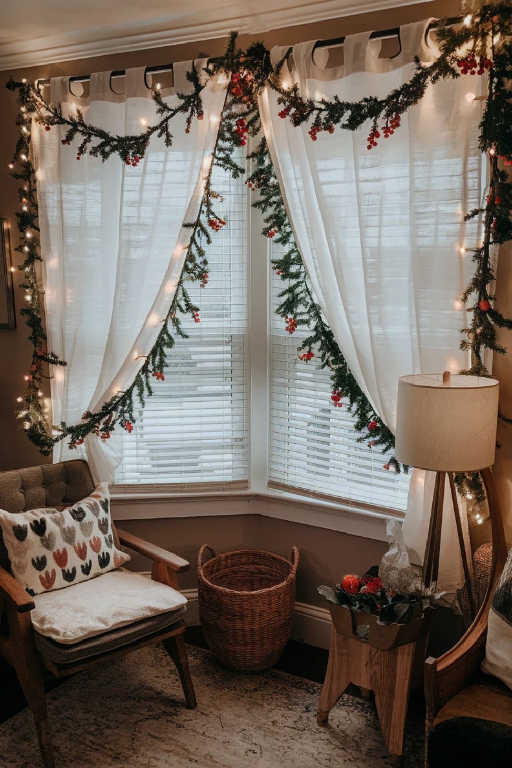 Give your curtains a Christmas upgrade by wrapping the rods with garlands or fairy lights. Choose greenery garlands with berries or ornaments for a lush look. The lights will add a subtle sparkle, making your living room or bedroom feel even cozier.