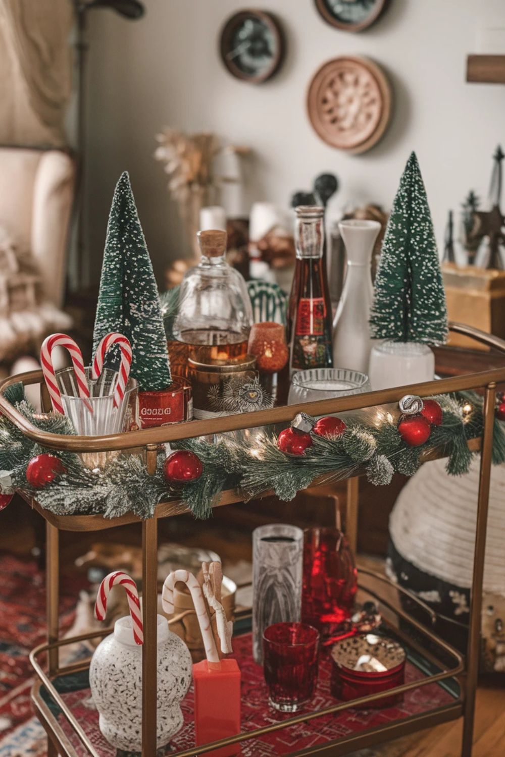 A bar cart is a fun and functional way to add Christmas charm. Decorate it with a few mini trees, candy canes, or garlands. Stock it with festive drinkware like glasses with snowflake designs and bottles wrapped in holiday-themed labels. Add a small bowl of garnishes such as cranberries or cinnamon sticks to keep things festive and functional.