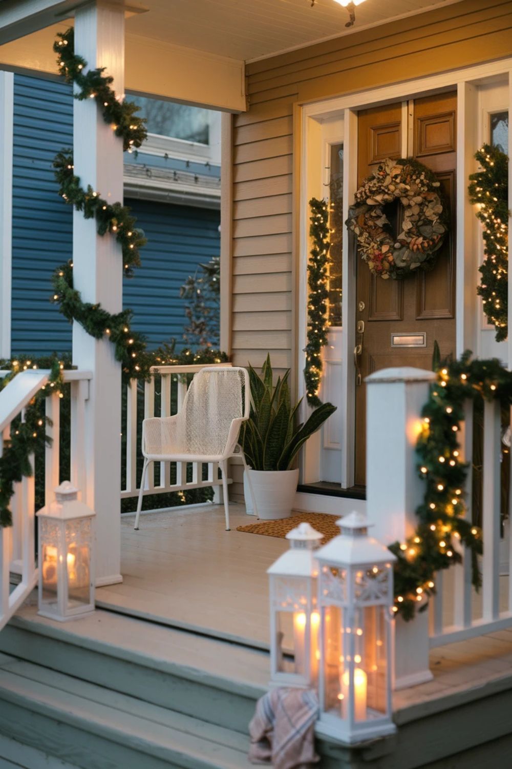 Your front porch sets the tone for your home, so make it count! Start with a lush Christmas wreath on your door—choose one adorned with berries, pinecones, and ribbons for a traditional look. Line your porch railings with garlands intertwined with twinkling lights. Add lanterns filled with LED candles or ornaments to frame the entryway. For a finishing touch, include a festive doormat with a cheerful holiday message. Bonus points if you add small Christmas trees or potted poinsettias on either side of the door.