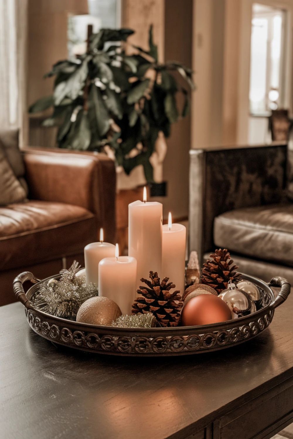 Your coffee table can be a focal point of your living room decor. Create a centerpiece using a mix of candles, ornaments, pinecones, and a small garland. Arrange these on a decorative tray for an organized yet festive look. Include a holiday-themed book or two for added charm.