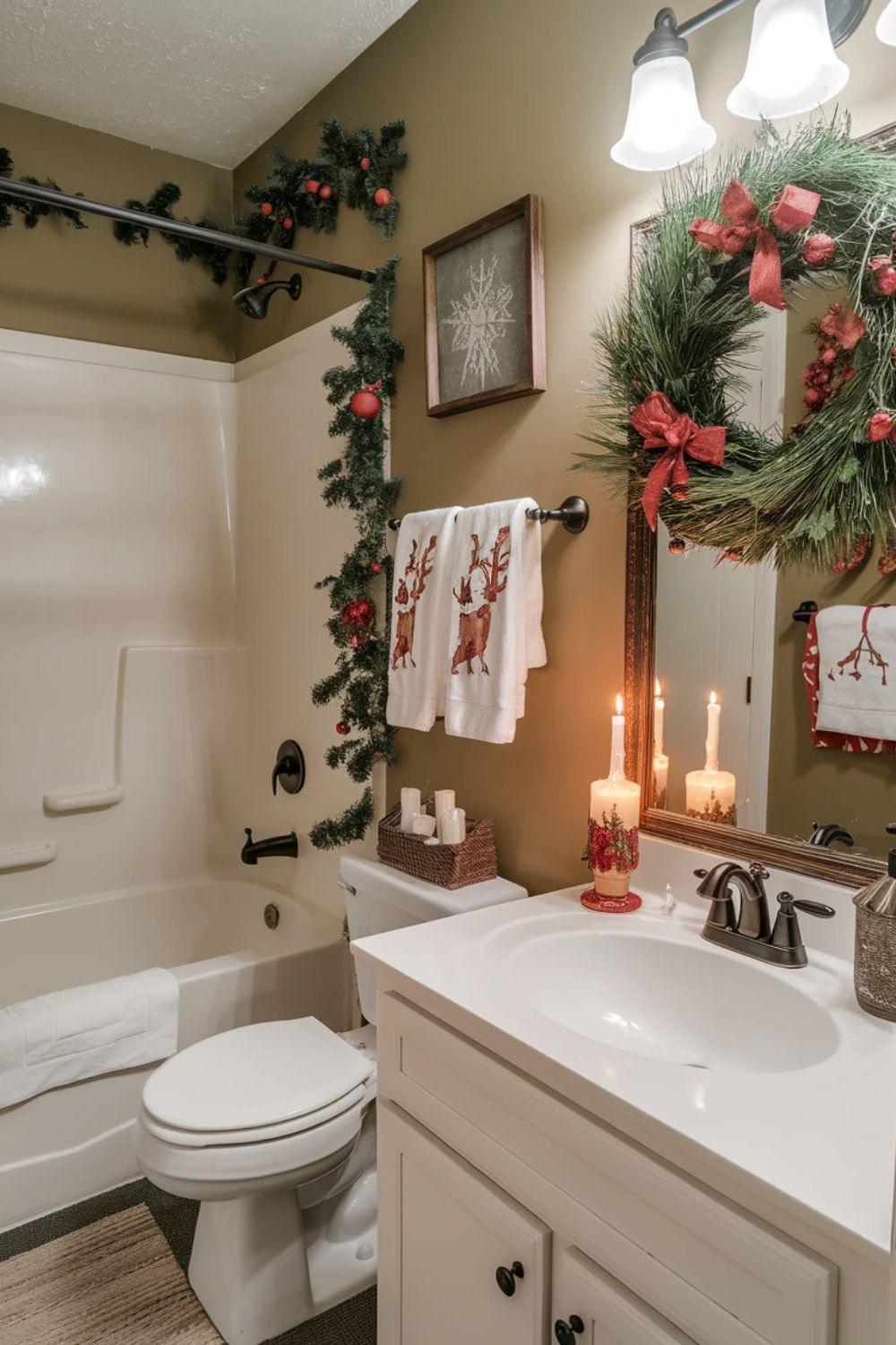 Even your bathroom can join the festive spirit! Swap out your regular hand towels for Christmas-themed ones featuring snowflakes, reindeer, or Santa motifs. Add a festive soap dispenser or a small candle with a holiday scent like cinnamon or pine. If space permits, place a miniature wreath or a decorative jar filled with ornaments or pinecones on the counter. A tiny touch like this can make the space feel warm and inviting.