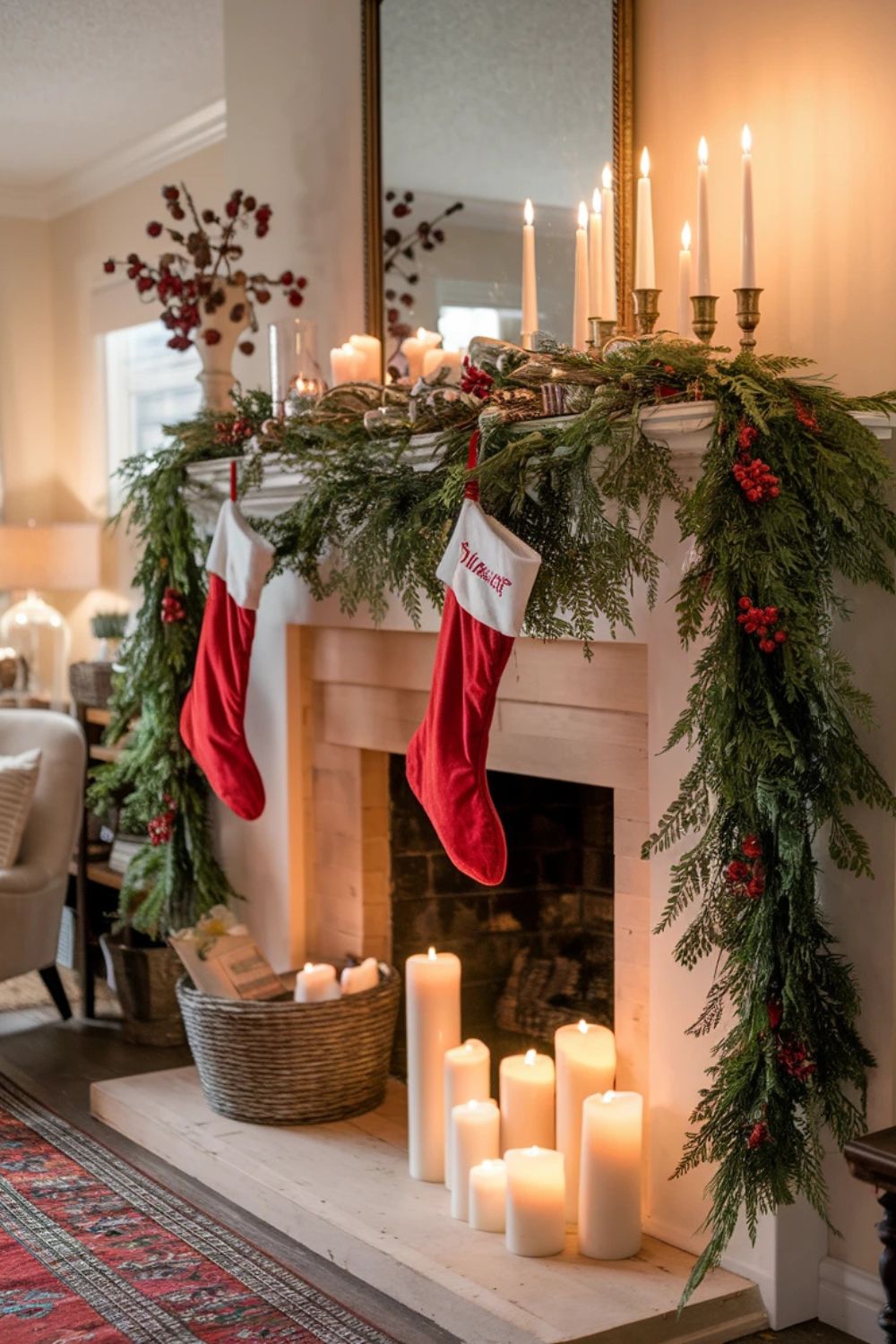The fireplace mantel is a classic spot for Christmas decor. Start with a garland of fresh or faux greenery and layer it with string lights. Add stockings for each family member, hung evenly across the mantel. Incorporate festive figurines, candles, or small potted poinsettias for an elegant display. To complete the look, hang a large mirror or a festive piece of artwork above the mantel.