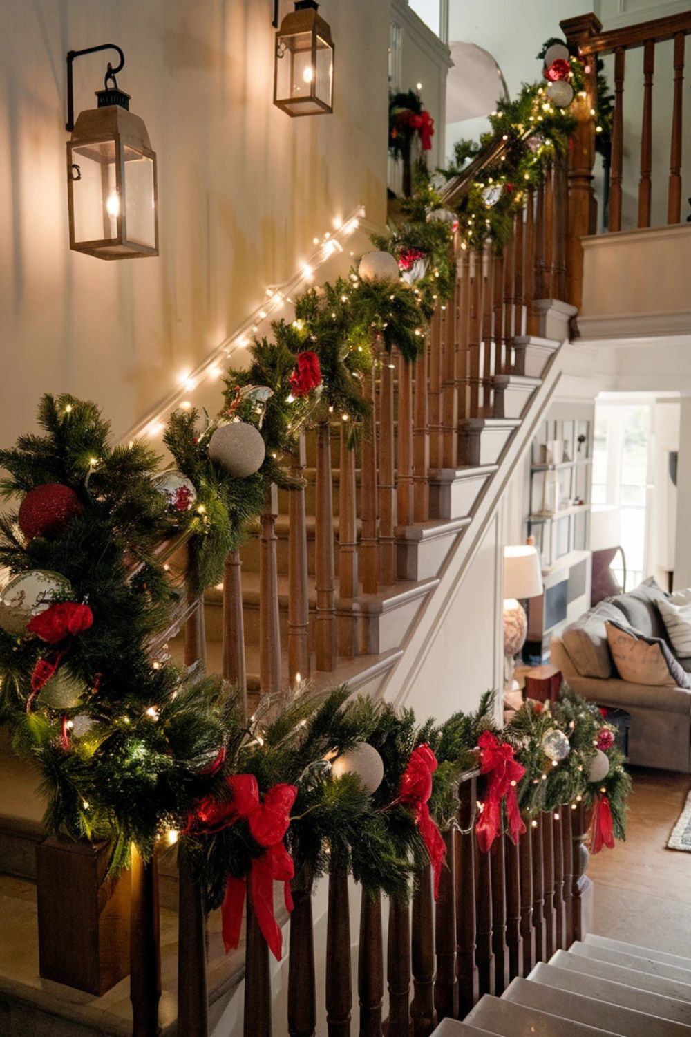 Turn your staircase into a festive masterpiece by draping garlands along the railings. Use a mixture of greenery, ornaments, and ribbons for texture and color. Add string lights or bows at regular intervals for an eye-catching effect. It’s an effortless way to bring the Christmas spirit to your home’s entryway.