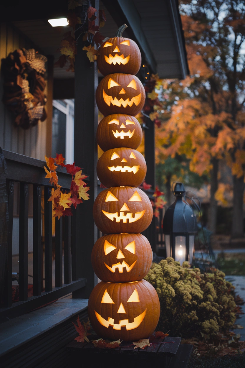 A pumpkin topiary adds height and interest to your front porch. Stack three or four pumpkins of varying sizes on top of each other, and decorate them with paint, glitter, or carved faces. Secure them with a dowel or pole to ensure they don’t topple over. This topiary can also be illuminated by placing small LED lights inside each pumpkin.