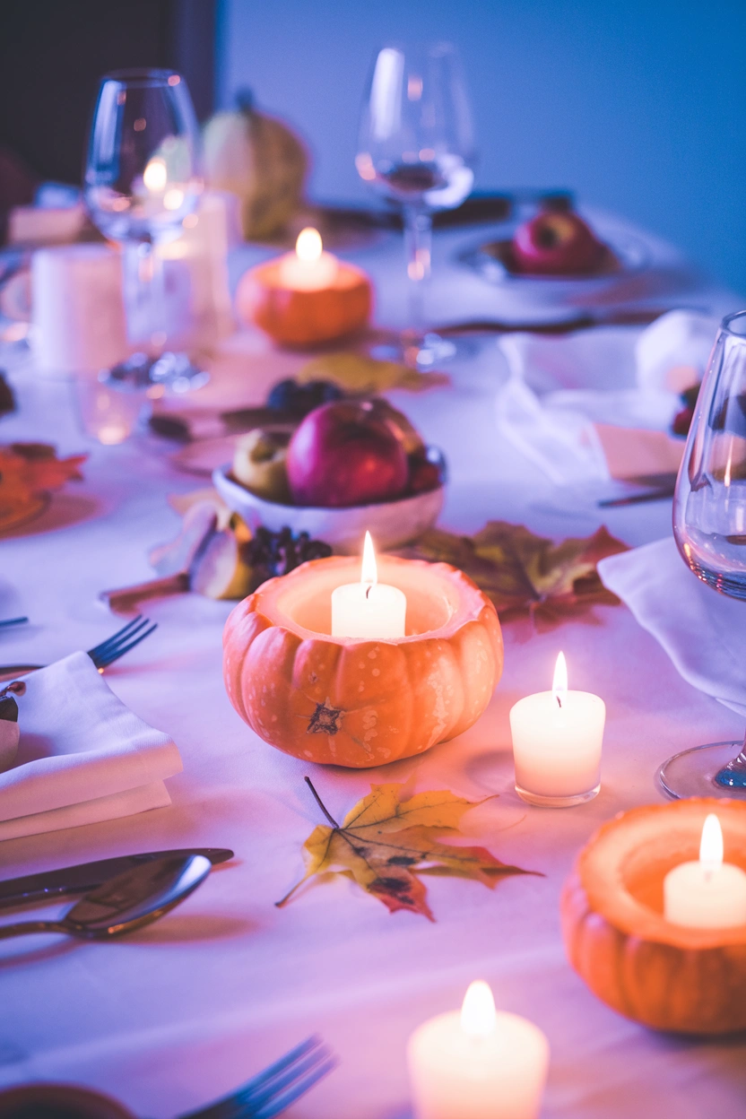 Elevate your Halloween table setting by using small pumpkins as candle holders. Hollow out the pumpkins and insert taper candles into the top. These can serve as elegant centerpieces for your dining room or coffee table. Mix and match different pumpkin colors to suit your interior aesthetic, from classic orange to trendy white and black.