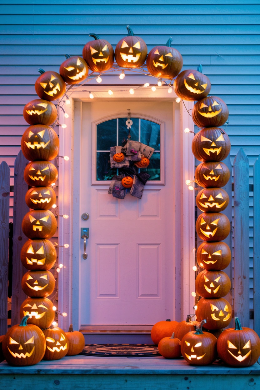 One of the most eye-catching ways to decorate your front entrance is by creating a glowing pumpkin arch over the door. Use different-sized pumpkins (both real and faux) to form an arch, and carve them to include cut-out patterns for a magical glow at night. Add string lights or LED candles inside each pumpkin to light up your entryway for a welcoming yet spooky atmosphere.