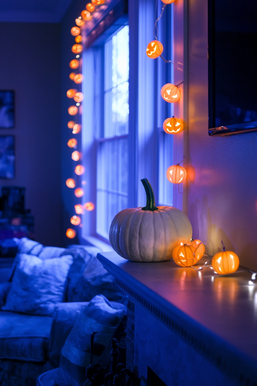 For a cozy yet festive vibe, hang pumpkin-shaped string lights around windows, mantels, or shelves. These lights create a warm glow and are perfect for both Halloween and autumn in general. Use them to accent any room, adding a subtle but spooky touch to your décor.
