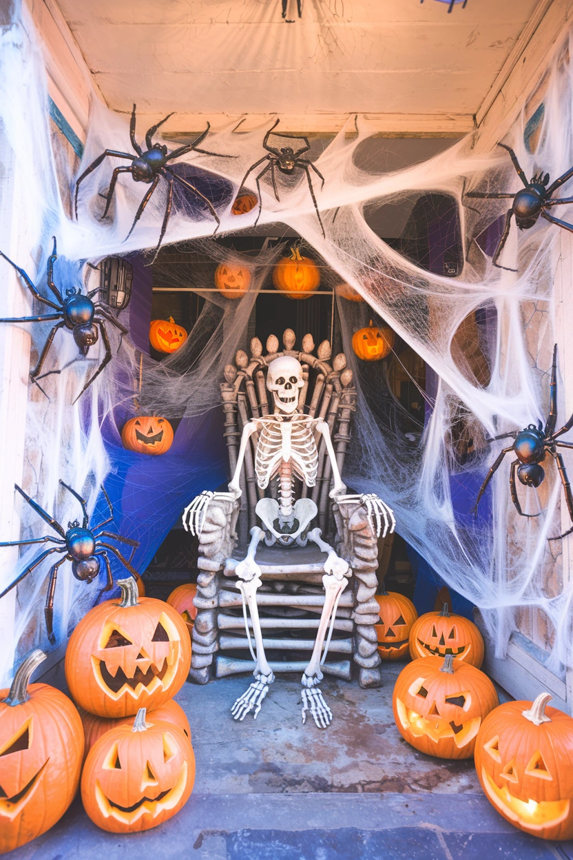 For an ultra-spooky outdoor look, place a skeleton near your entrance and surround it with fake spiders and spider webs. Drape faux webbing around the doorframe, shrubs, and porch railings to create the illusion of an abandoned, haunted house. Enhance the effect by placing pumpkins carved with spider motifs next to the skeleton. homesandgardens