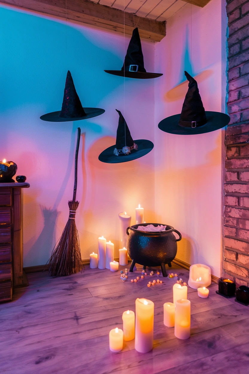 Create an enchanting atmosphere indoors by hanging floating witch hats from the ceiling. Using clear fishing wire, suspend lightweight hats at varying heights throughout your living room or hallway. Pair these with battery-operated LED candles or floating pumpkins for a whimsical yet spooky look.