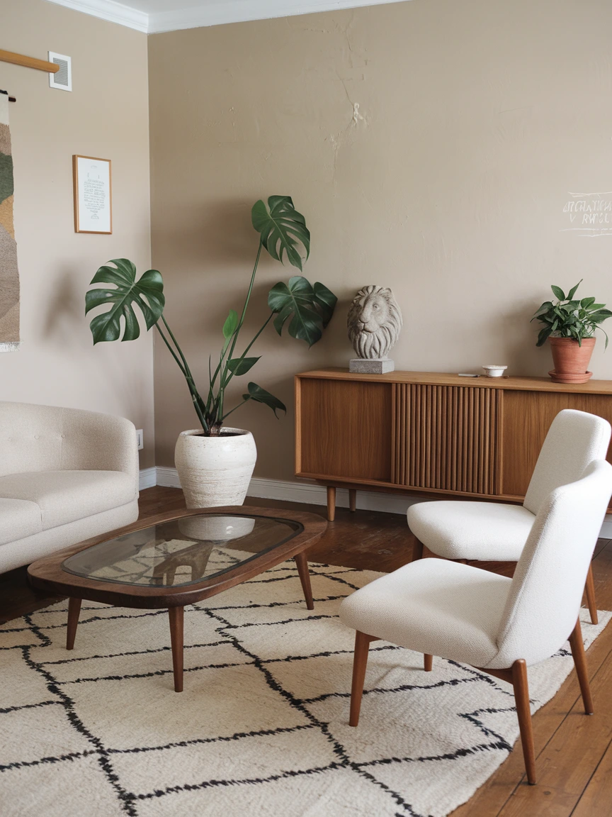 Plants like monstera, snake plants, or ferns thrive in minimal light and add a lush, organic element to your living space. Place them in simple ceramic or terracotta pots to keep the look understated. Natural stones, wooden sculptures, or woven baskets can also enhance the earthy ambiance.