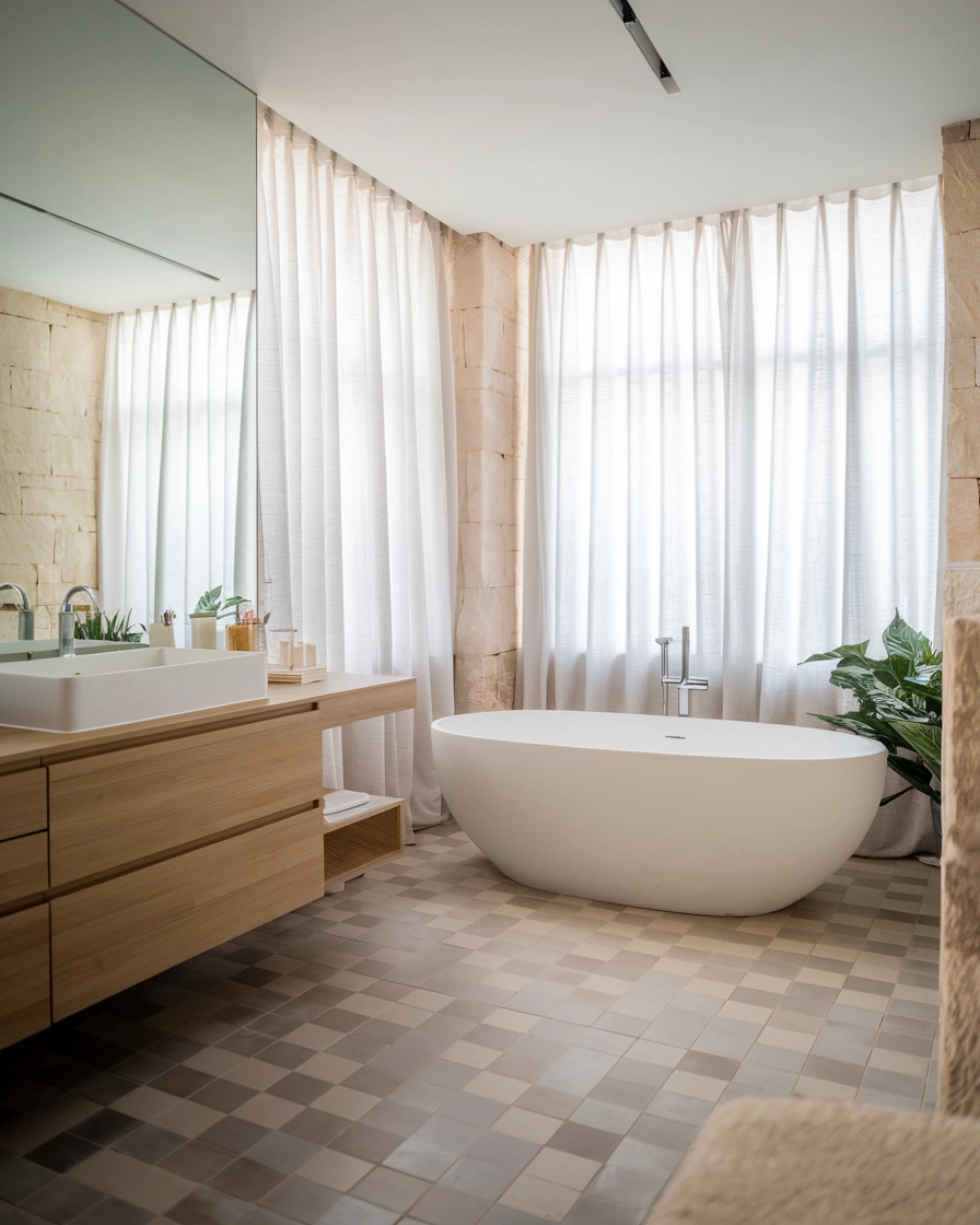Elegant Shower Curtain: Opt for a high-quality, neutral shower curtain to enhance your bathroom’s elegant vibe.