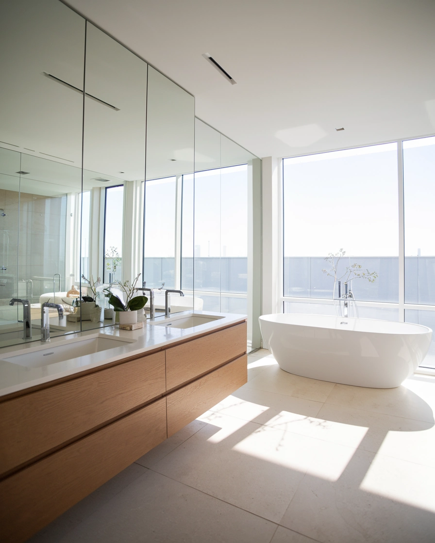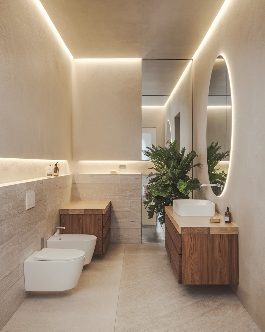 Good lighting is key to achieving a spa-like feel. Opt for ambient lighting that creates a warm, soft glow, ideal for unwinding after a long day. Dimmable lights or sconces around the mirror or tub can set the mood, providing the perfect lighting for a relaxing bath or skincare routine.