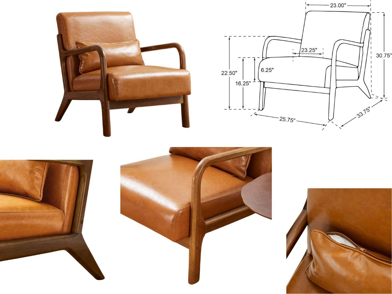 Coffee Accent armchair is made of 30% rubberwood, 30% foam 15% PU Leather and 25% Plywood. Overall Dimension: 25.75 ”L x 33.75 ”W x 30.75 ”H, Seat height: 16.25" Holds over 330lbs with its wooden frame, solid Rubberwood frame for long-lasting durability
