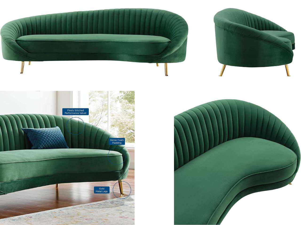Reinventing mid-century design with glam deco style, this curved back sofa charms with vertical channel tufting, gold accents, and asymmetrical shape
