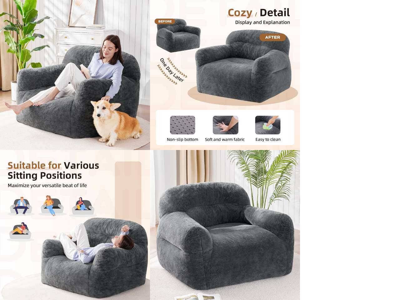 Measuring 50" x 45.5" x 33.5", the oversized bean bag chair fits all body types. The ergonomic backrest and armrests offer exceptional support, with quick rebound for lasting comfort. Non-slip fabric prevents movement