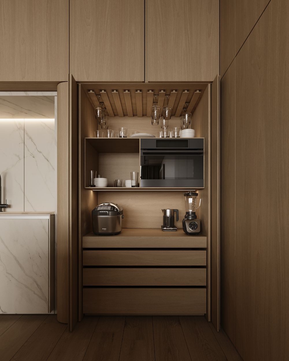 Pro Tip: Incorporate a spice drawer or rack near your cooking area for quick and easy access while cooking. For frequently used appliances, a designated countertop space can save the hassle of constantly moving them in and out of storage.