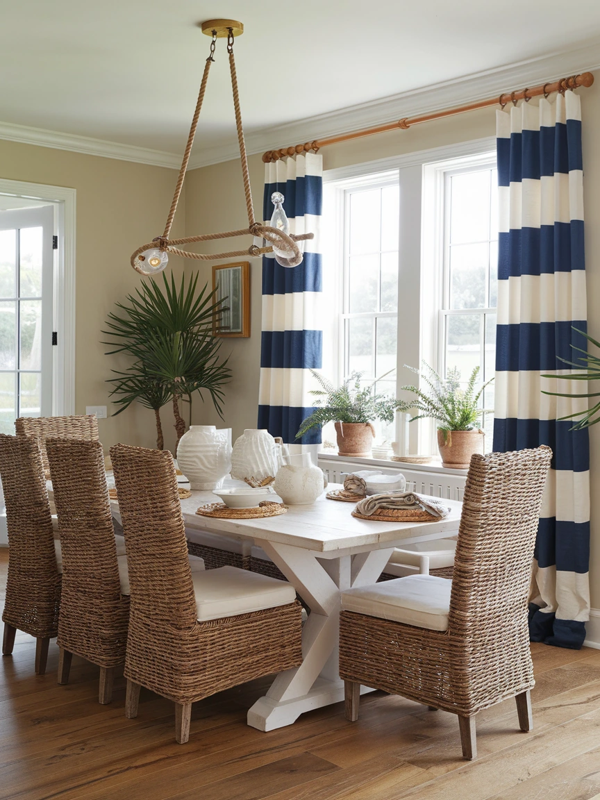Coastal-inspired dining rooms evoke the relaxed vibe of a seaside retreat. Use a whitewashed dining table and wicker chairs to create an airy feel. Incorporate soft blue and white accents through cushions and rugs. Lantern-style light fixtures and nautical-themed decor complete the breezy, coastal look.