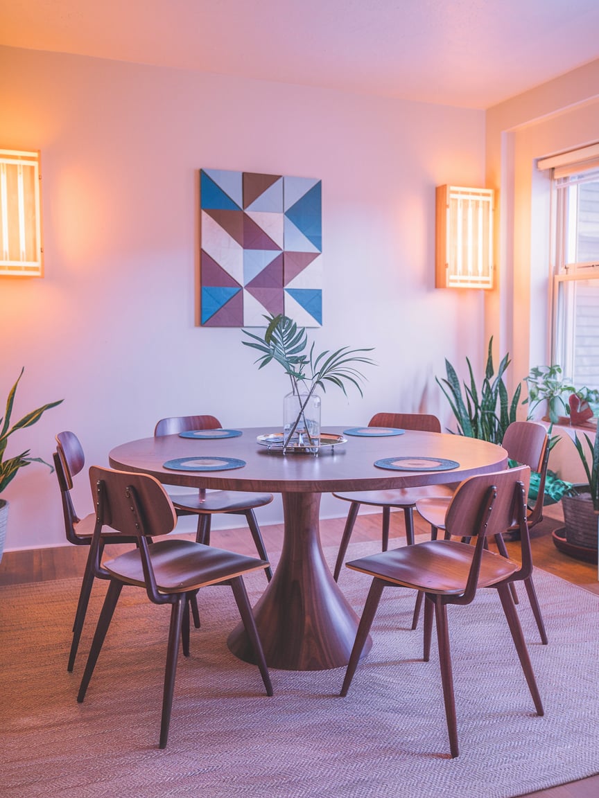 Mid-century modern design is known for its sleek lines and timeless appeal. Choose a round walnut dining table and pair it with retro-inspired dining chairs for a stylish statement. Keep the decor minimal, incorporating geometric art for the walls. For a touch of sophistication, opt for brass or gold-toned lighting fixtures to tie the space together elegantly.