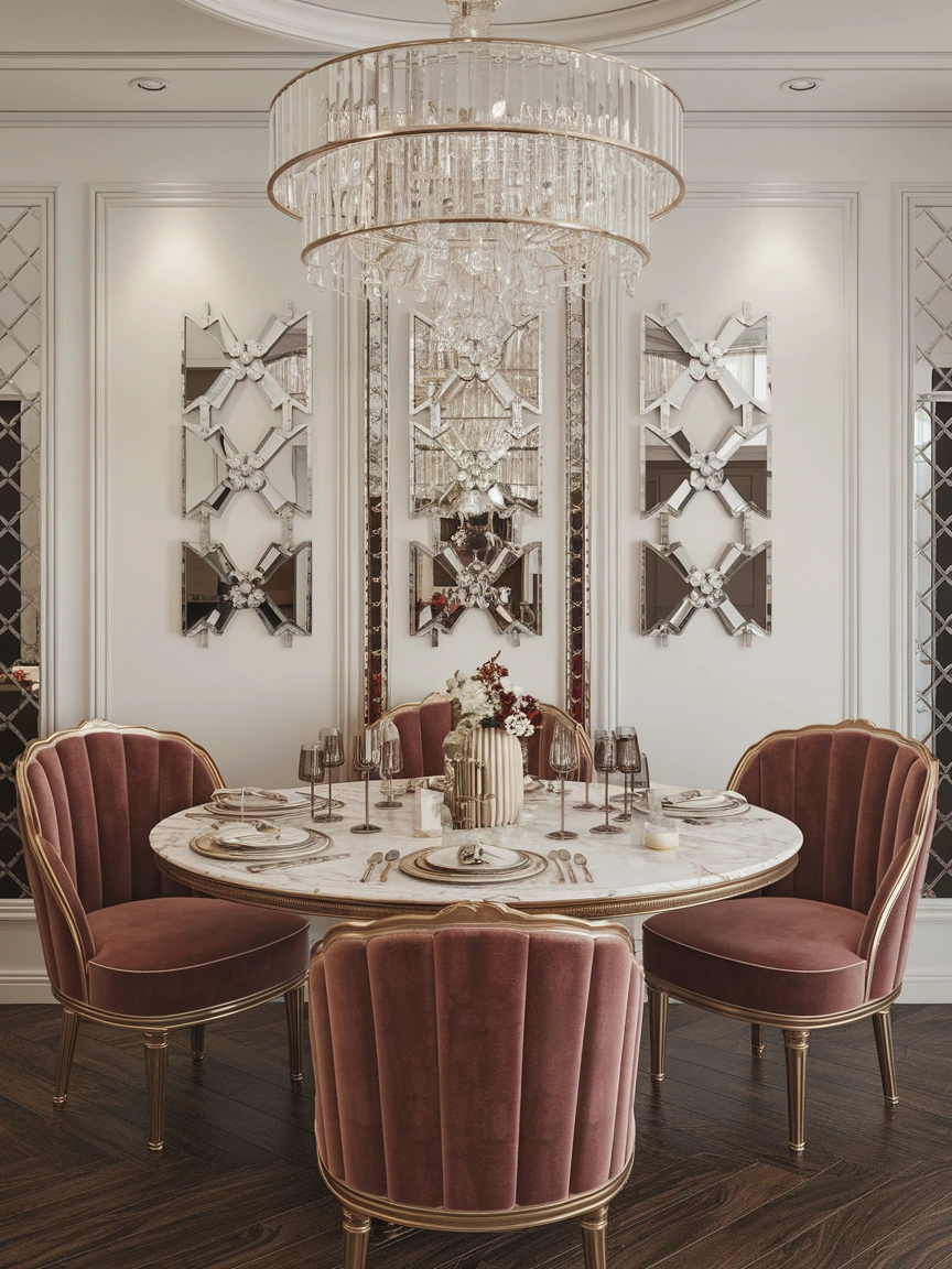 A luxurious dining room is all about opulence and sophistication. Use a marble-top dining table and velvet-upholstered chairs to set the tone. Add metallic accents like gold or silver in the decor. Crystal chandeliers or recessed lighting complete the elegant look, while mirrored dining room wall decor enhances the glamour.