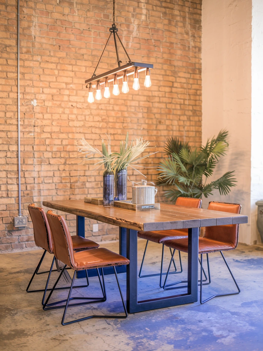 Industrial style brings a rugged, edgy aesthetic to your dining room. Think exposed brick walls, metal accents, and a reclaimed wood dining table for authenticity. Complement the look with leather or metal dining chairs and dramatic lighting, such as Edison bulb chandeliers. Add warmth and balance with soft area rugs and touches of greenery for a space that feels both raw and inviting.