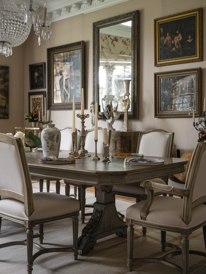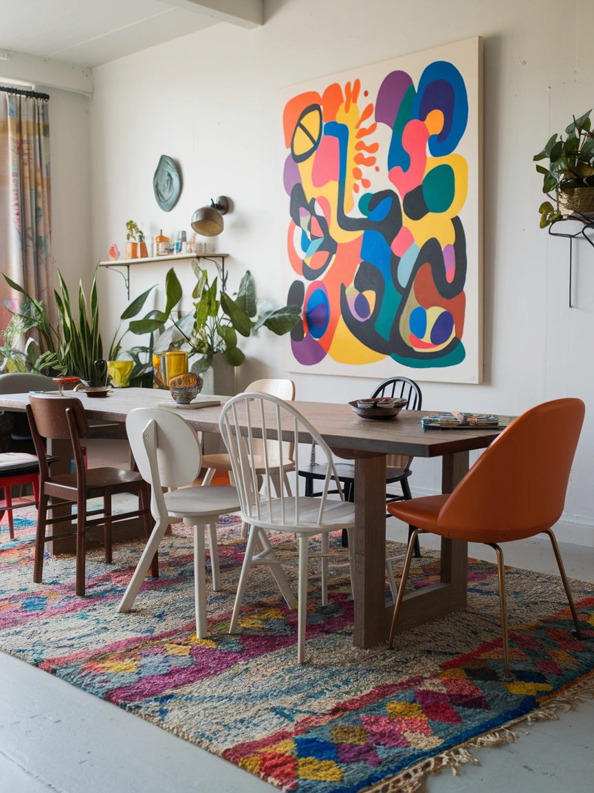 An eclectic dining room blends styles, colors, and materials for a unique look. Use mismatched dining chairs, a vibrant area rug, and bold wall art to express creativity. The key is balance—pair bold pieces with neutral elements to avoid overwhelming the space, creating an inviting and playful atmosphere.