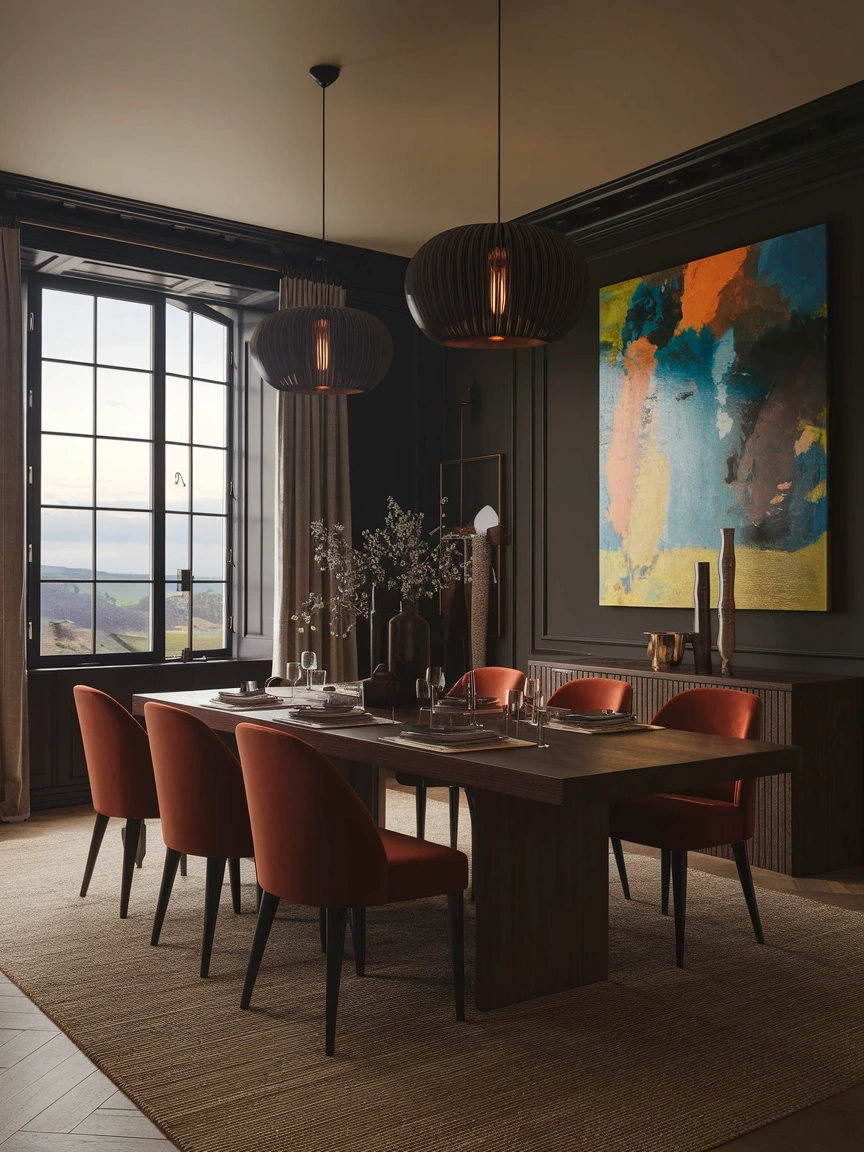 Create drama with dark walls, rich textures, and moody lighting. A dark wood dining table paired with velvet-upholstered chairs adds sophistication. Include a bold statement piece, such as a large mirror or a striking art piece, and use pendant lighting with a warm glow for ambiance.