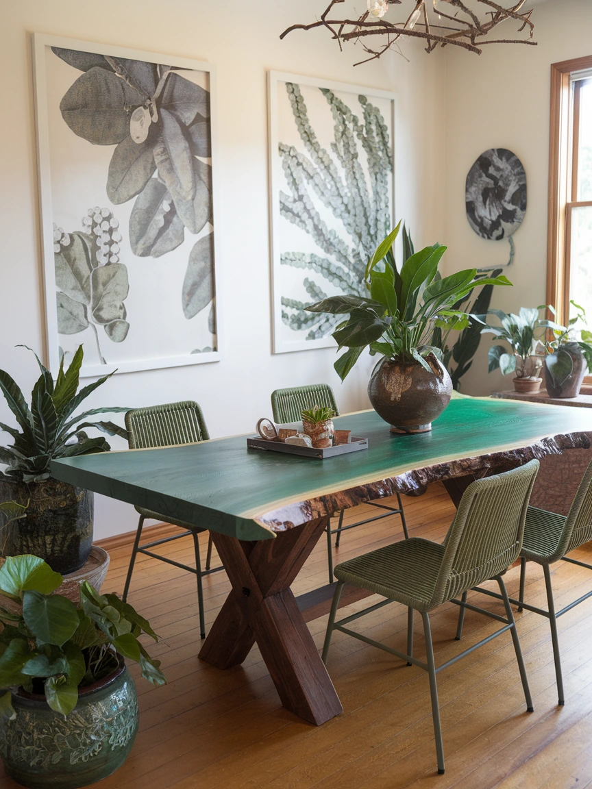 Nature-inspired decor brings tranquility to your dining space. A live-edge wood dining table paired with green velvet dining chairs sets the tone. Add potted plants and botanical-themed wall art to tie the room to the outdoors. Natural fiber rugs enhance the organic feel, creating a refreshing and calming atmosphere.