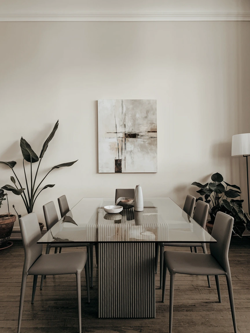 Minimalist design is ideal for those who appreciate simplicity. Use a monochrome color palette and sleek furniture to create a calm and uncluttered dining area. A glass-top dining table with matching chairs complements the look. To add interest, hang a single piece of abstract art on a plain wall to serve as a subtle focal point.