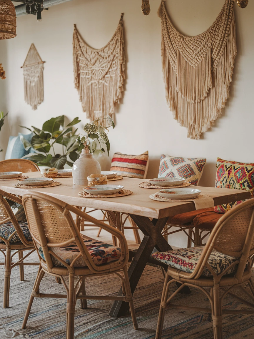 Bohemian dining rooms exude a relaxed, artistic vibe. Combine a rustic wooden dining table with rattan or wicker dining chairs for a natural feel. Layer colorful cushions and throws on the chairs, and add a jute rug for texture. Finish with macramé wall hangings and warm lighting to create a cozy, eclectic space.