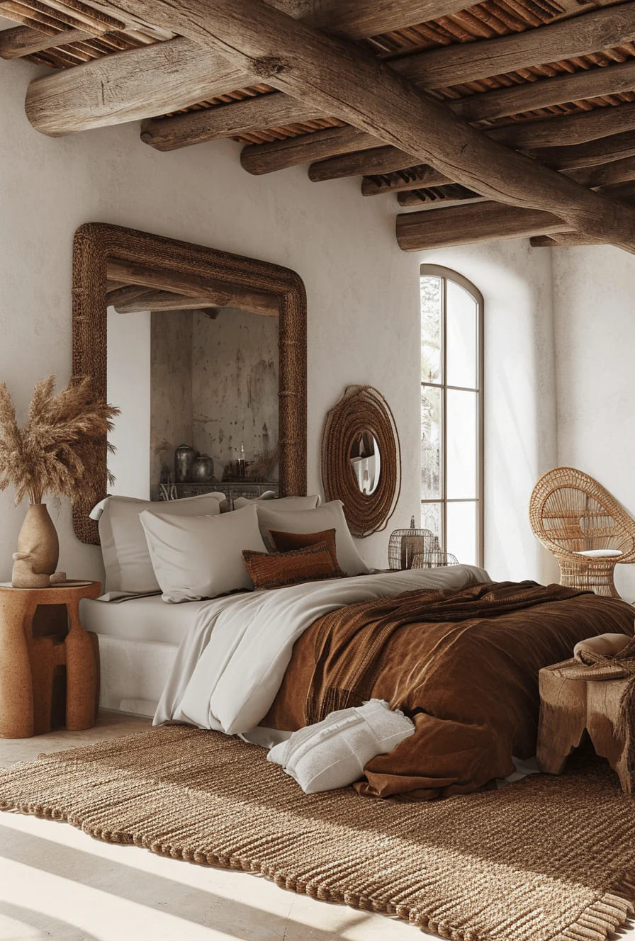 By the window, the gentle ingress of daylight enhances the room’s warm and inviting atmosphere. Decorative elements crafted from wood and wicker echo the room’s connection to nature, while vases and dried plants complement the earthy tones. This image captures a serene bedroom design that’s both rustic and refined, a perfect retreat for relaxation.