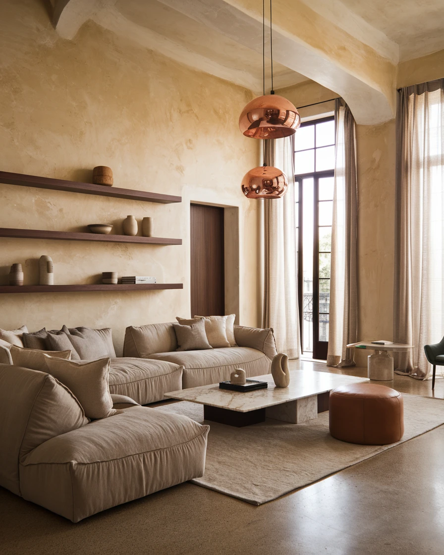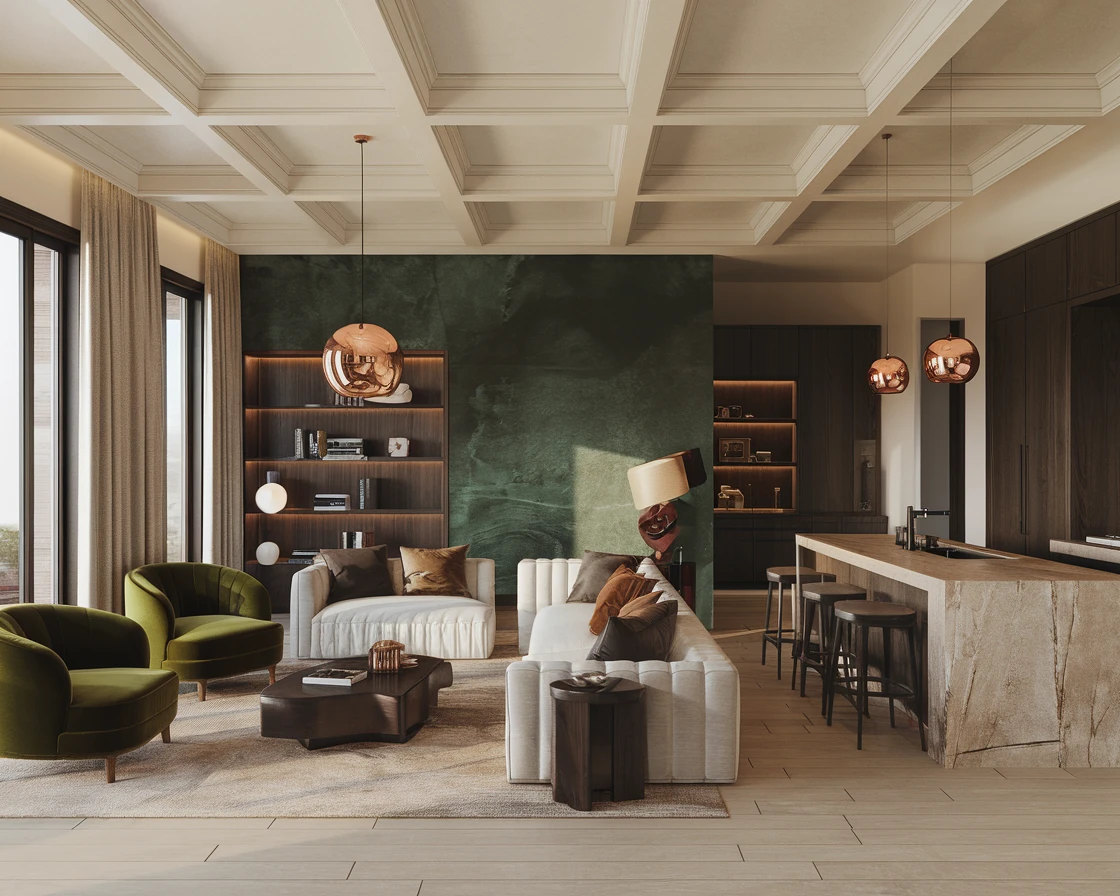 2025 interior design colors focus on earthy neutrals, deep jewel tones, and nature-inspired hues. Trending shades include warm taupe, terracotta, sage green, deep emerald, midnight blue, and muted mustard. These colors create a balance between bold statement-making interiors and calming, minimalist aesthetics.
