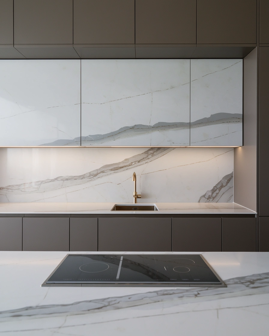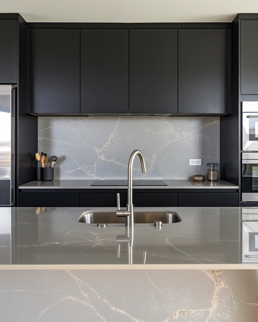 ✅ Slab Backsplash (Quartz or Granite): Extends from the countertop with no grout lines, making it super easy to wipe down.
