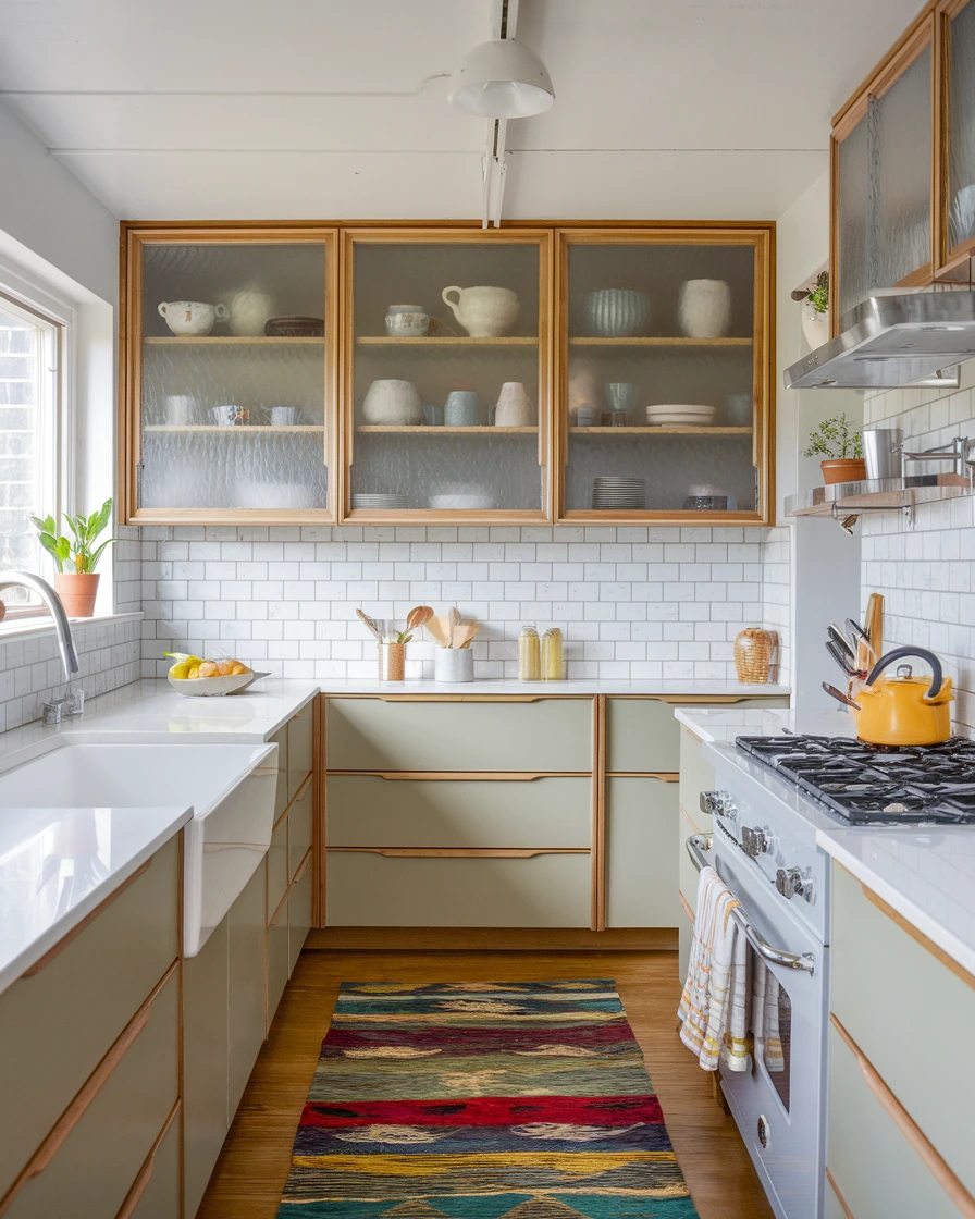 Incorporate textiles for softness and pattern contrast. A geometric runner (“mid century modern kitchen rug”) in wool or flat-weave anchors the floor and provides comfort underfoot Handles & More Hardware Ltd.. Seat cushions in bold, abstract prints on kitchen stools inject pops of color and tie back to backsplash motifs. For durability, choose washable fabrics in mid-century palettes—mustard yellow, teal, or olive green Edward George.