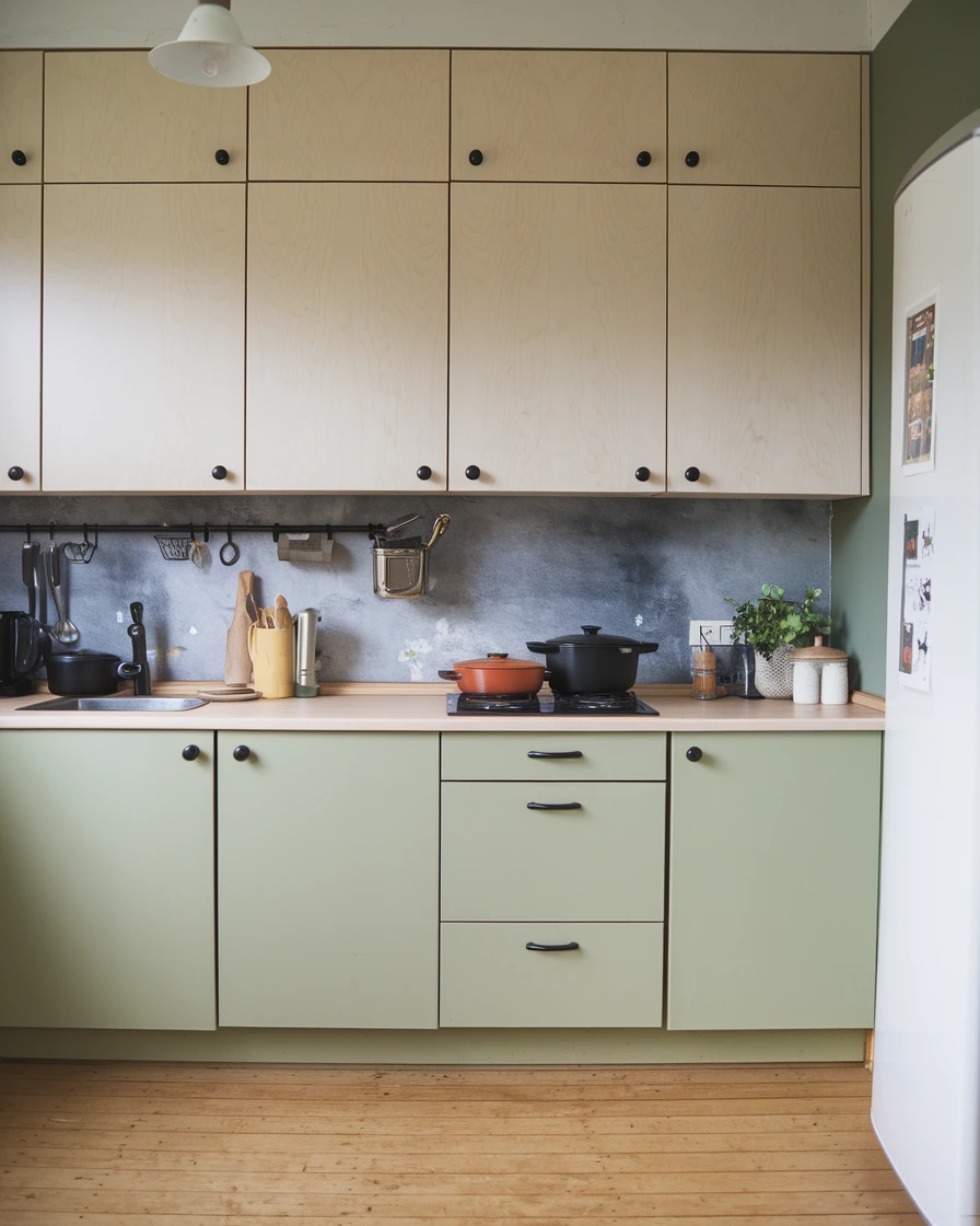 For a more adventurous take, consider black lower cabinets with natural oak uppers—the deep base anchors the room, while the oak’s grain and tone introduce organic warmth and texture Pinterest. If you prefer a softer statement, sage green lowers paired with birch-finish uppers offers a nod to vintage MCM color stories while feeling fresh and nature-inspired Wood & Wire.