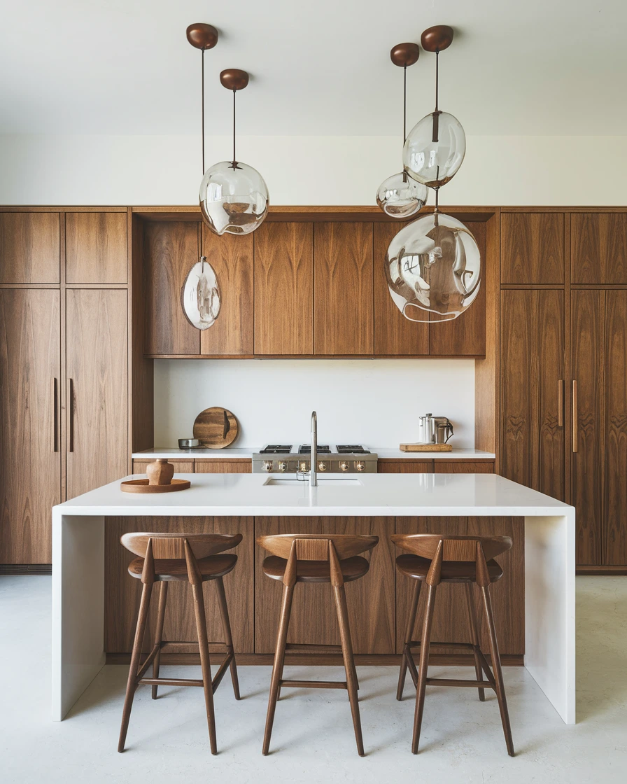 Sculptural Pendants: Iconic Sputnik and orb-style fixtures above islands create focal points and reflect the space-age optimism of the 1950s .