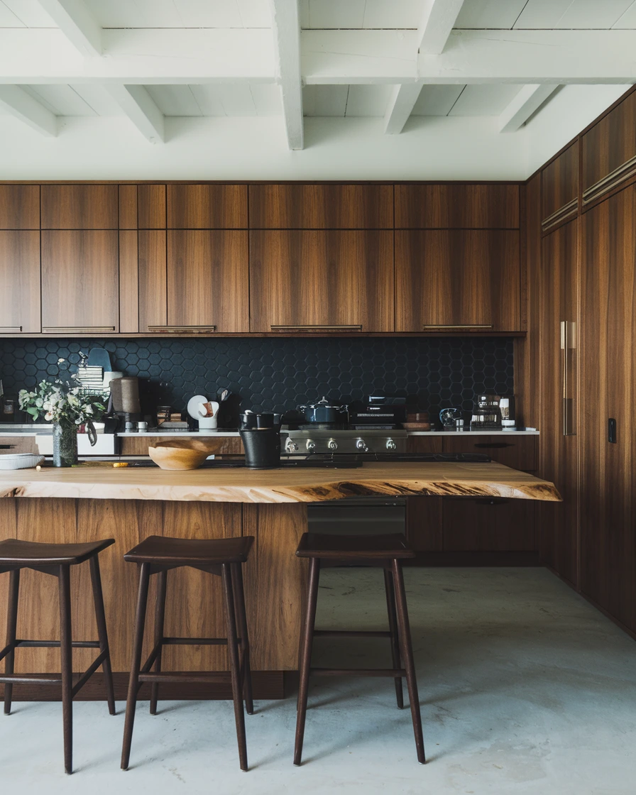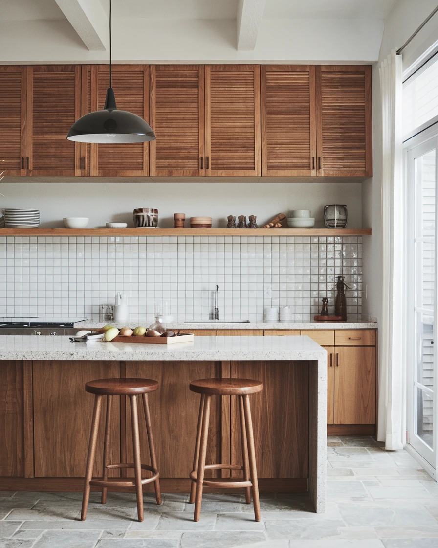 Beyond cabinets, integrate rattan or cane-woven drawer fronts and open shelving to introduce tactile contrast and mid-century flair Satin and Slate Interiors. Terrazzo countertops or flooring—composed of marble, quartz, or glass chips in cement—add durability and a subtle pattern that complements wood tones without competing visually Pinterest.
